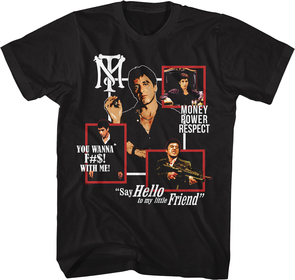 This Scarface t-shirt features a collage of images of Tony Montana from the 1983 classic. The shirt shows three iconic quotes from the movie, including "Money Power Respect", "You wanna f#$k with me!", and "Say hello to my little friend!"