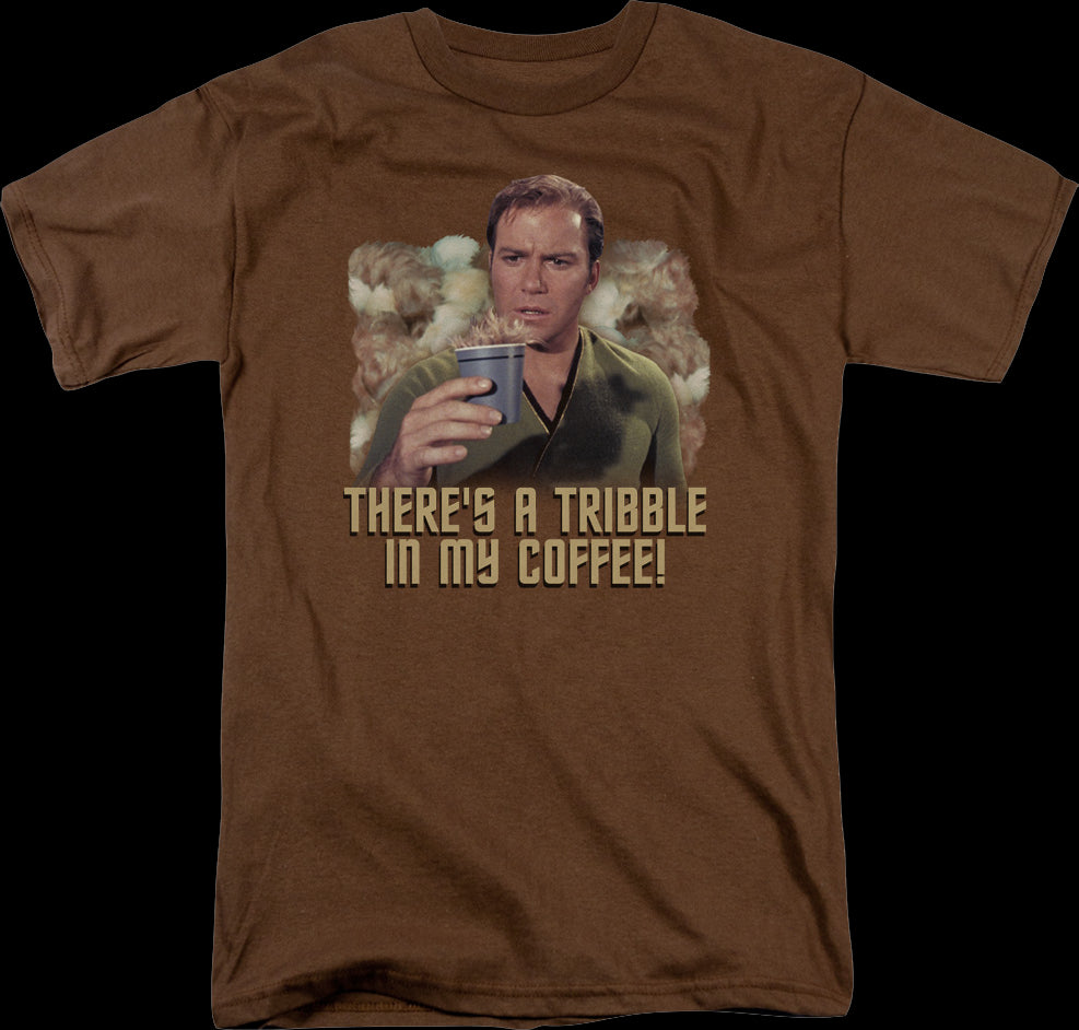 This Star Trek t-shirt shows Captain James T. Kirk looking curiously at a Tribble in his coffee cup. The shirt reads There's A Tribble In My Coffee!