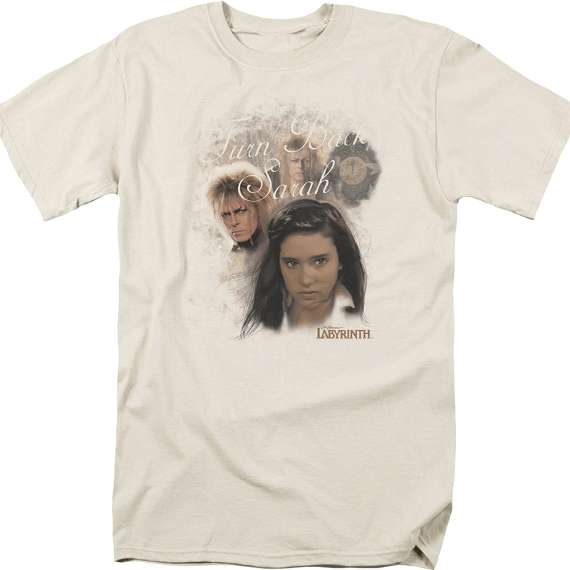 This Labyrinth t-shirt features images of Sarah Williams and Jareth, the king of the goblins. The shirt reads Turn Back Sarah.