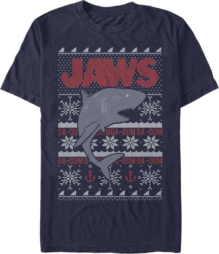 This Jaws t-shirt is designed to look like an ugly knit Christmas sweater. The shirt shows a great white shark in front of a festive pattern that features shark teeth, snowflakes, anchors, and the Jaws theme song "Da-Dum-Da-Dum".