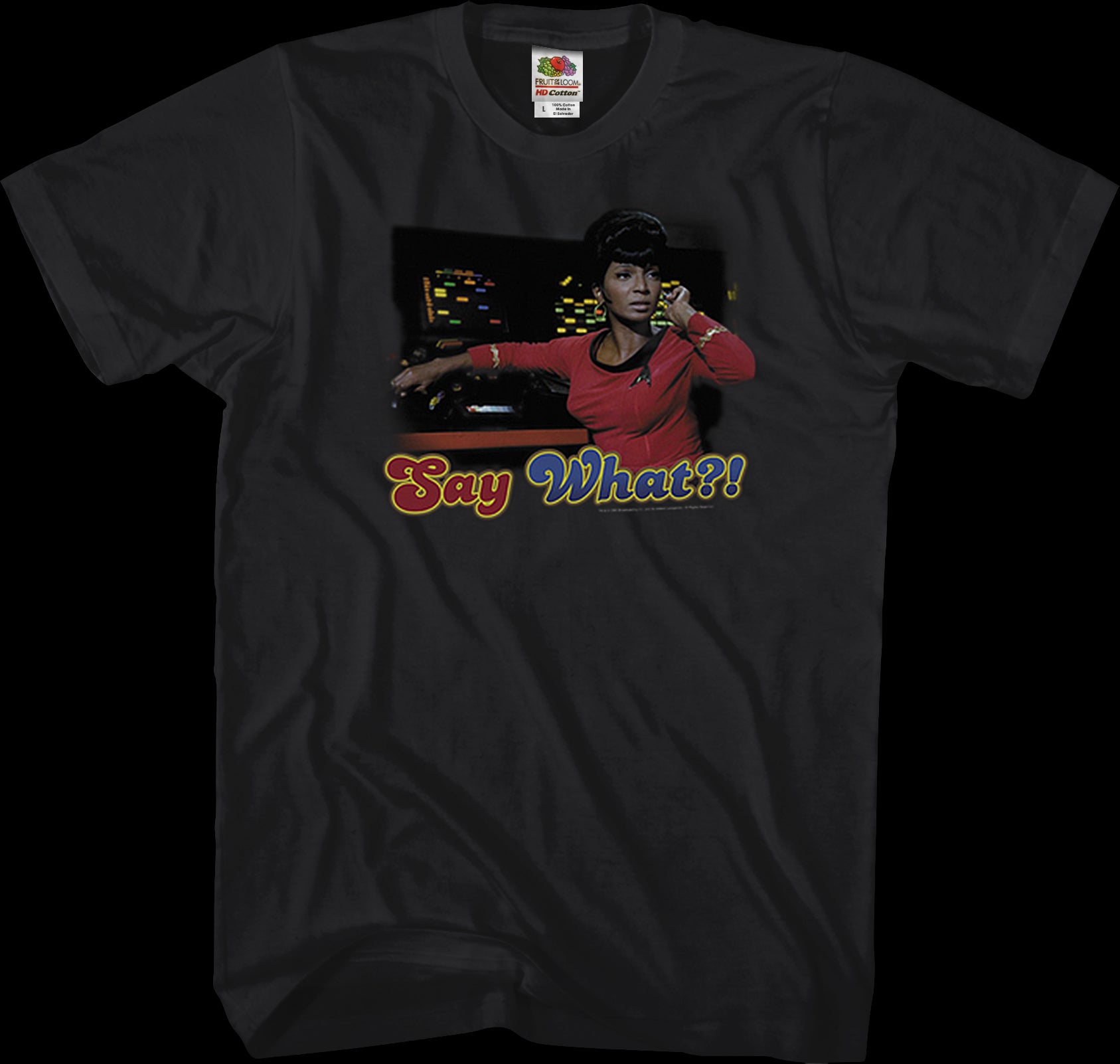 Any fan of the legendary science fiction franchise will agree, this Uhura Say What Star Trek T-Shirt is a must-have!
