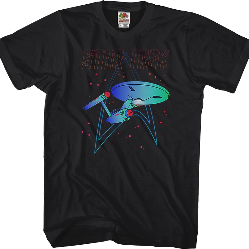USS Enterprise Star Trek T-Shirt features an image of the USS Enterprise and the Starfleet symbol.
