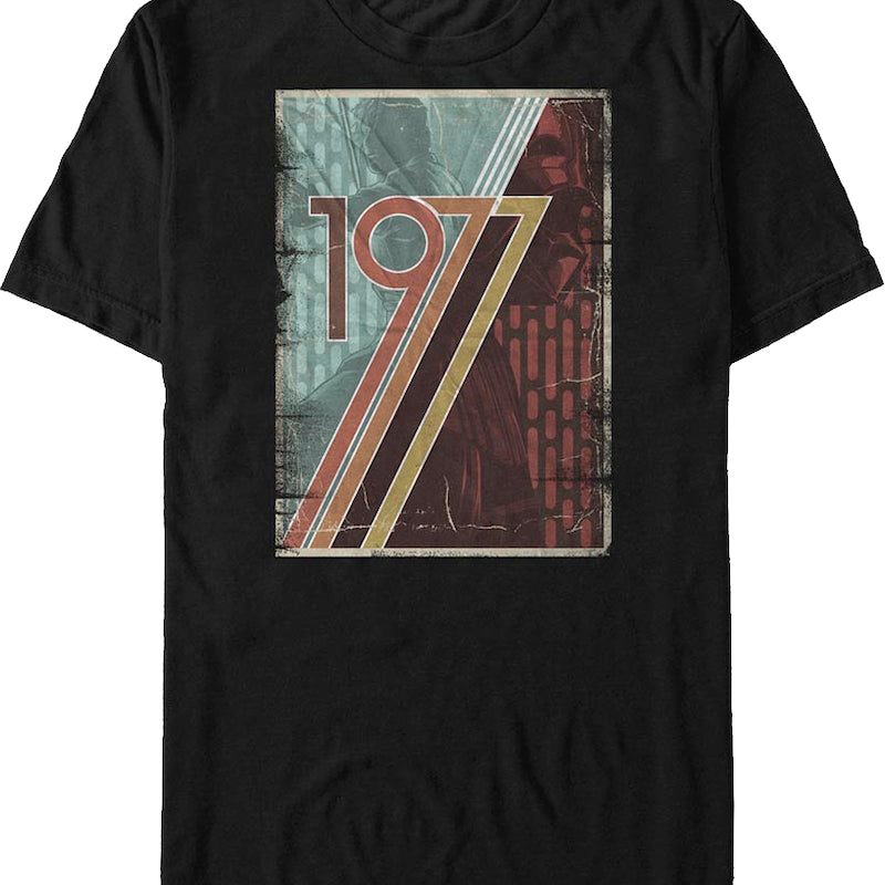This Star Wars t-shirt shows a split picture that is separated by the year 1977. One half of the pictures shows Luke Skywalker, the other half shows Darth Vader.