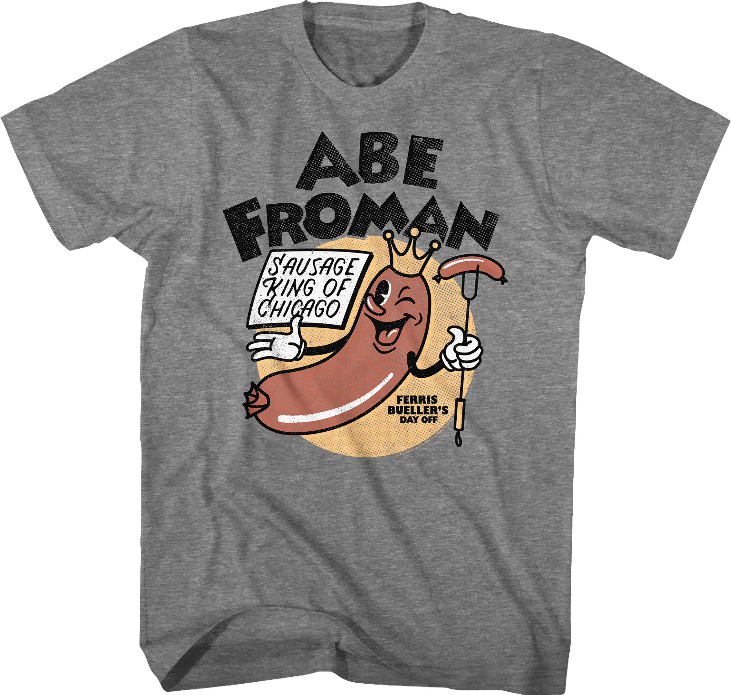 This Ferris Bueller's Day Off t-shirt features a sausage link mascot for Abe Froman, who is the Sausage King of Chicago.