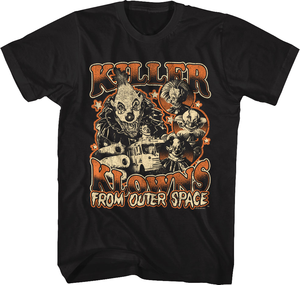 This Killer Klowns From Outer Space t-shirt features a collage that shows images of Klownzilla, Magori, Shorty, and Jumbo.