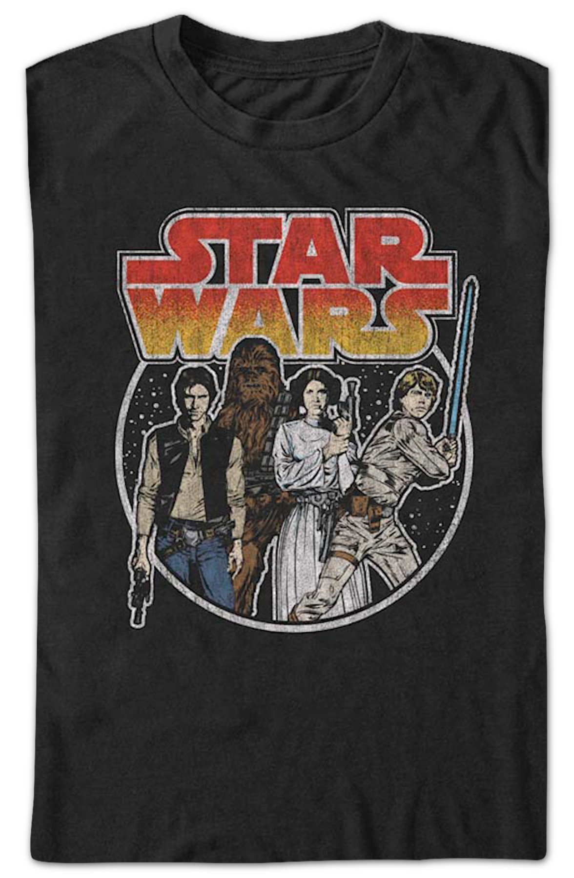 This Star Wars t-shirt features an image of the heroic characters Han Solo, Chewbacca, Princess Leia, and Luke Skywalker.