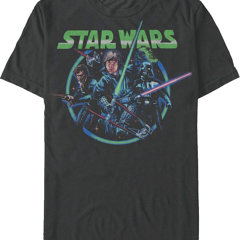 This Star Wars t-shirt shows Han Solo, Luke Skywalker, and Darth Vader in a circle that includes images of the Death Star and TIE fighters.