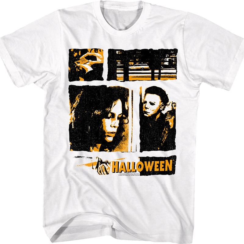 This Halloween t-shirt features a collage of images from the 1978 classic. The collage shows a matchbook from the Rabbit In Red Lounge, the car that Michael Myers stole from Smith's Grove Sanitarium, Laurie Strode, and Michael Myers holding a knife.