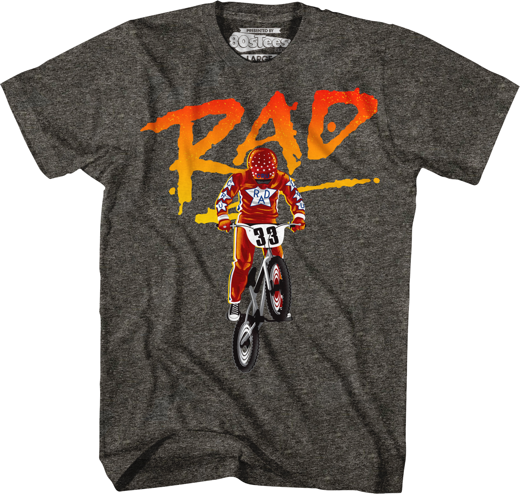 Cru Jones loves ass-sliding and riding his BMX bike. This 80sTees.com exclusive Rad t-shirt features an image of Cru Jones riding his bike, number 33 at the Helltrack race.