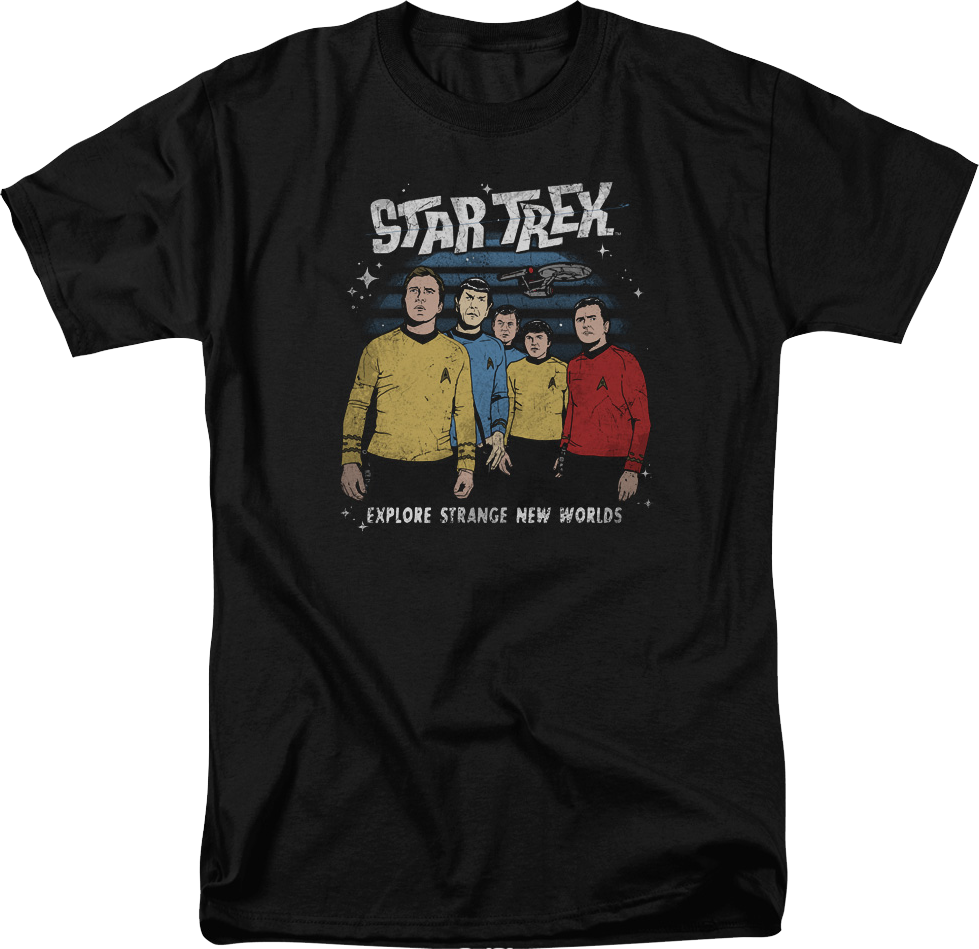 This Star Trek t-shirt features illustrated images of James T Kirk, Spock, Leonard McCoy, Pavel Chekov, and Scotty. The shirt reads Explore Strange New Worlds.
