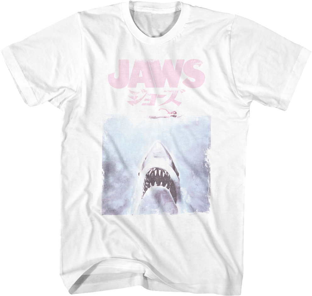 Everyone will know you are a fan of Steven Spielberg's terrifying classic starring Roy Scheider, Richard Dreyfuss, and Robert Shaw when you wear this Vintage Kanji Poster Jaws T-Shirt!