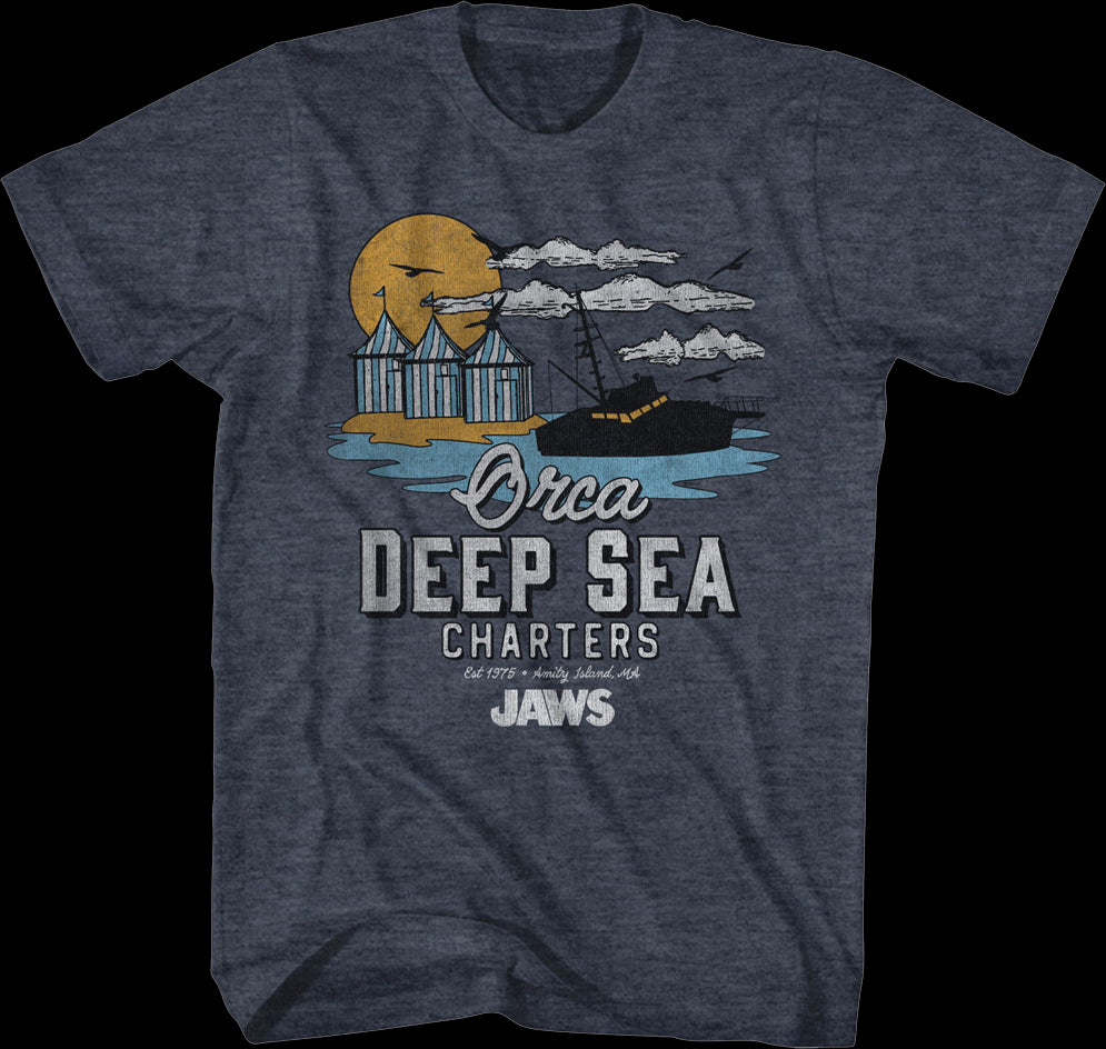 Jaws set box office records and is referred to as the first modern day blockbuster. Let everyone know that you are a fan of Steven Spielberg's 1975 classic when you wear this Vintage Orca Deep Sea Charters Jaws T-Shirt!