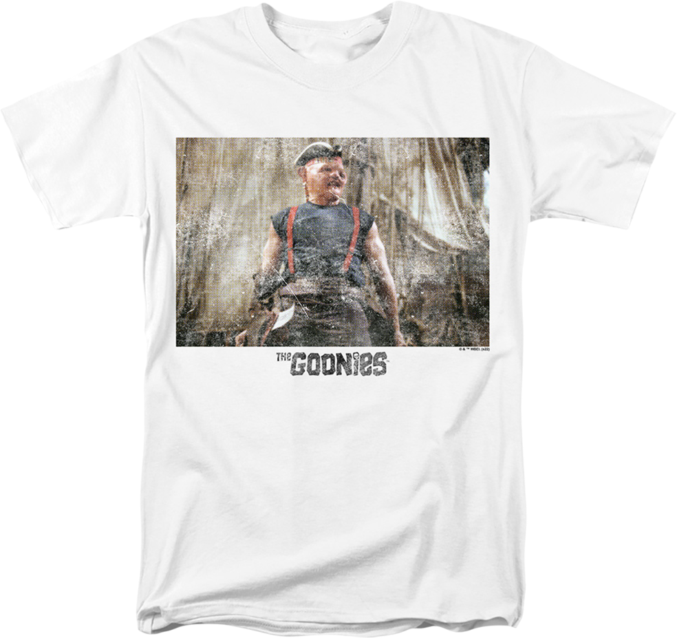 This Goonies t-shirt features an image of Sloth dressed as a pirate in the classic 1985 comedy. When Chunk first met Sloth, the deformed Fratelli brother was watching the pirate movie Captain Blood. This may have inspired Sloth's wardrobe choice when he saved The Goonies from walking the plank on the Inferno.