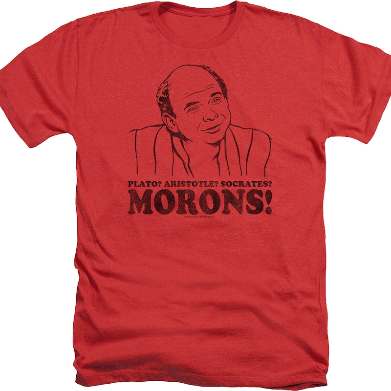 This Princess Bride t-shirt features a sketch of the Sicilian criminal Vizzini. The shirt includes Vizzini's classic quote, "Plato? Aristotle? Socrates? Morons!"