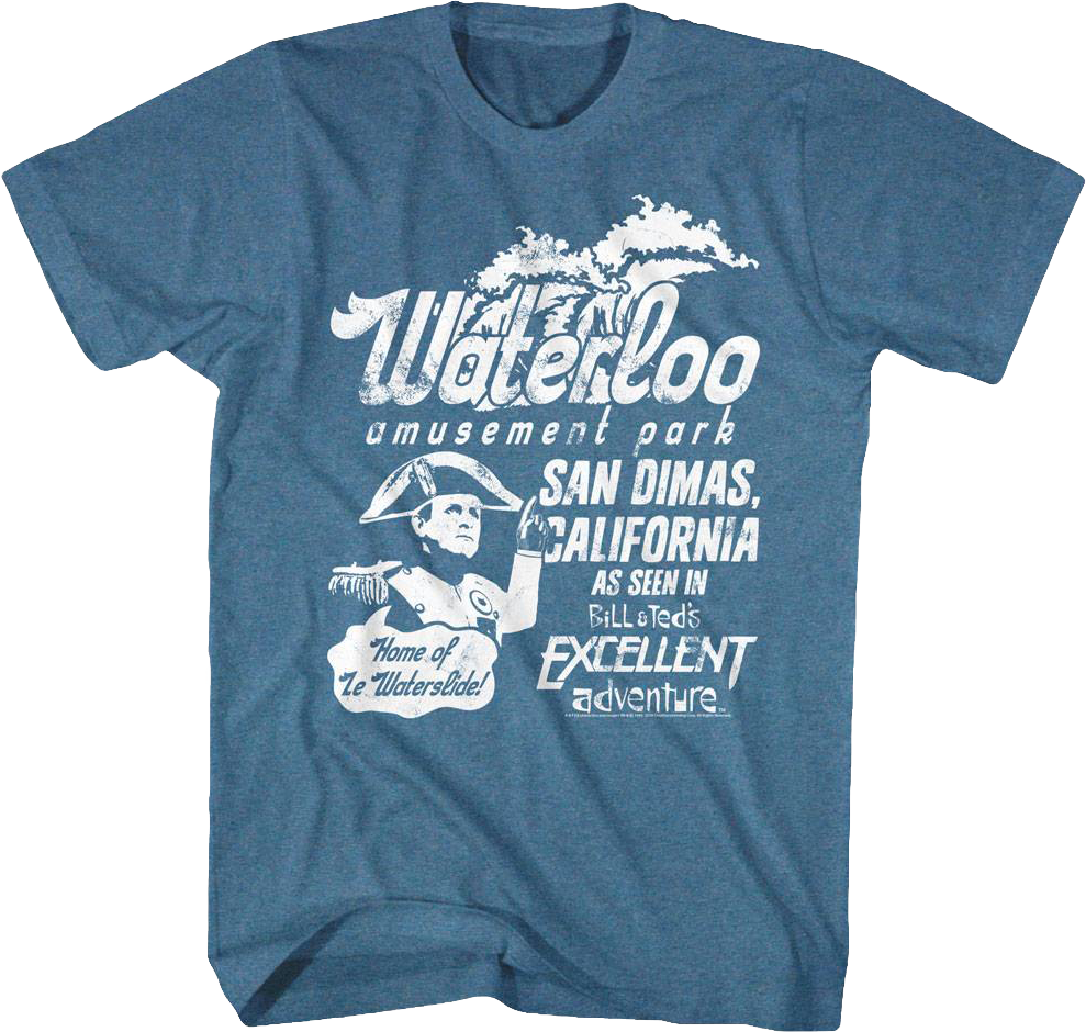 This Waterloo Bill and Ted's Excellent Adventure T-Shirt shows Napoleon advertising the Waterloo Amusement Park in San Dimas, California. He is saying, "Home of Le Waterslide!" with the movie's logo. If you were one of the greatest generals in history and you were stranded in San Dimas for one day, where would you go? Waterloo! The slides are so fun that you'll shove small children out of the way to get to the front of the line.