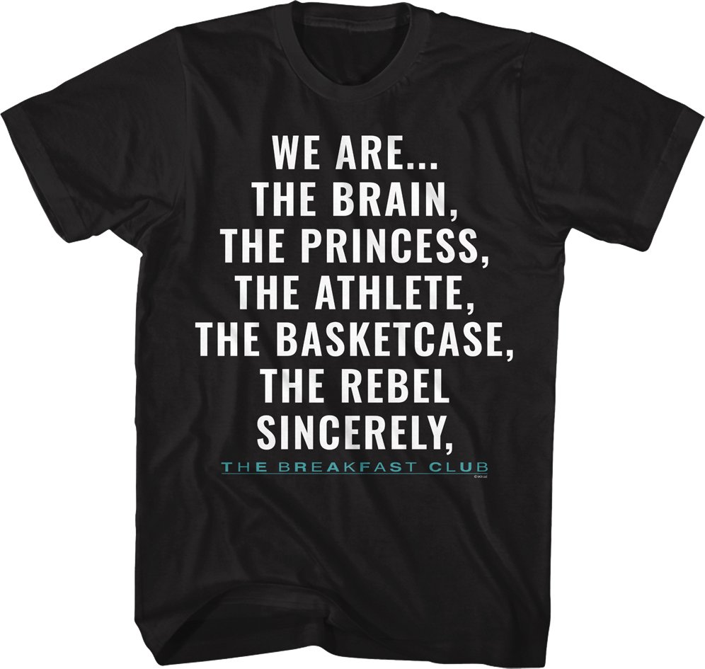 For any fan of John Hughes' 1985 classic starring Anthony Michael Hall, Molly Ringwald, Emilio Estevez, Ally Sheedy, and Judd Nelson, this We Are The Breakfast Club T-Shirt is a must have!