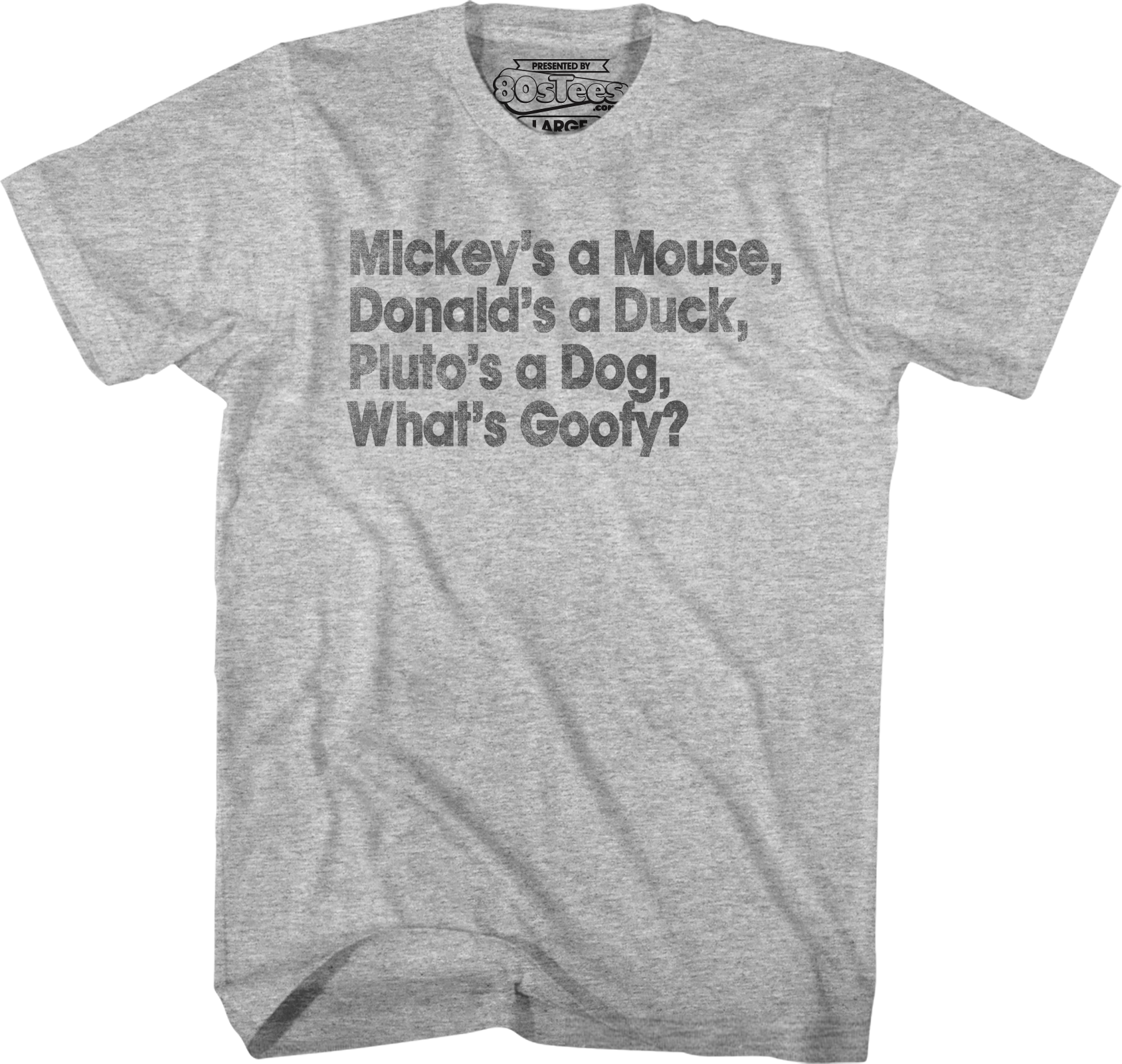 In Stand By Me, four friends, Gordie, Chris, Teddy and Vern went on a journey to find the dead body of Ray Brower. When night fell, the friends stopped and built a fire. They sat around the fire and had random conversations. Gordie delivered the quote that appears on this t-shirt, "Mickey's a Mouse, Donald's a Duck, Pluto's a Dog, What's Goofy?"