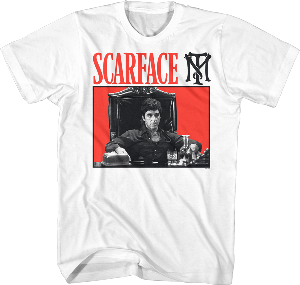 The front of this Scarface t-shirt features an image of Tony Montana sitting at his desk in his mansion. The back of the shirt includes Tony's famous quote, "In this country, you gotta make the money first. Then when you get the money, you get the power."