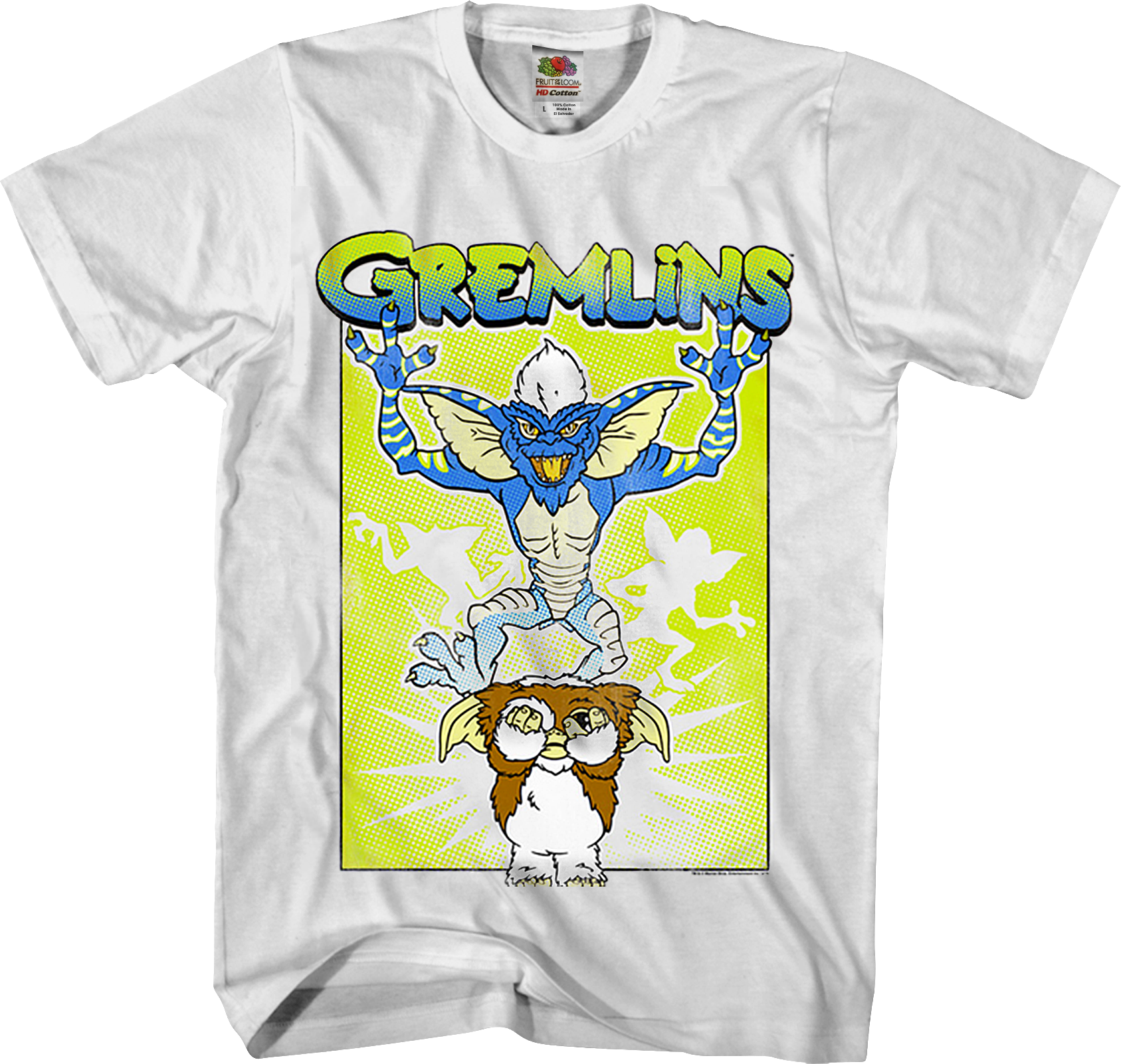 In the 1984 classic Gremlins, Billy Peltzer got a pet Mogwai named Gizmo. When Gizmo was exposed to water and fed after midnight, he spawned little creatures that grew into the monstrous gremlins that appear on this t-shirt.