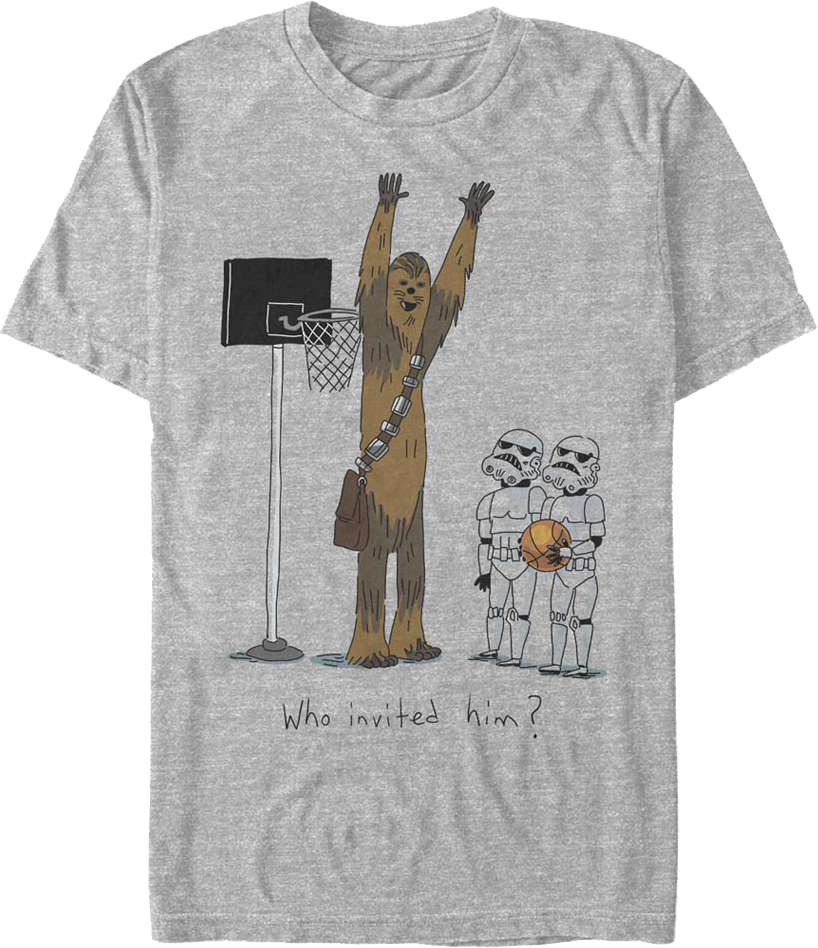 In the 1977 classic Star Wars, Luke Skywalker, Han Solo, and Chewbacca went on a mission to rescue Princess Leia. What the movie didn't show Chewbacca stopping by the Galactic Empire gymnasium, where Stormtroopers were playing basketball. Chewie decided to insert himself in the game, and he stood tall in the paint, blocking the Stormtroopers' shots, which made them ask the question "Who invited him?" For any fan of the legendary Wookiee Chewbacca, this Who Invited Him Star Wars T-Shirt is a must have!