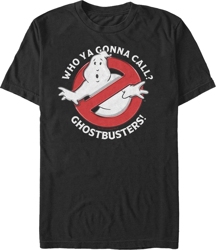 This Ghostbusters t-shirt shows the instantly recognizable no-ghost logo and the iconic slogan "Who Ya Gonna Call? Ghostbusters!"