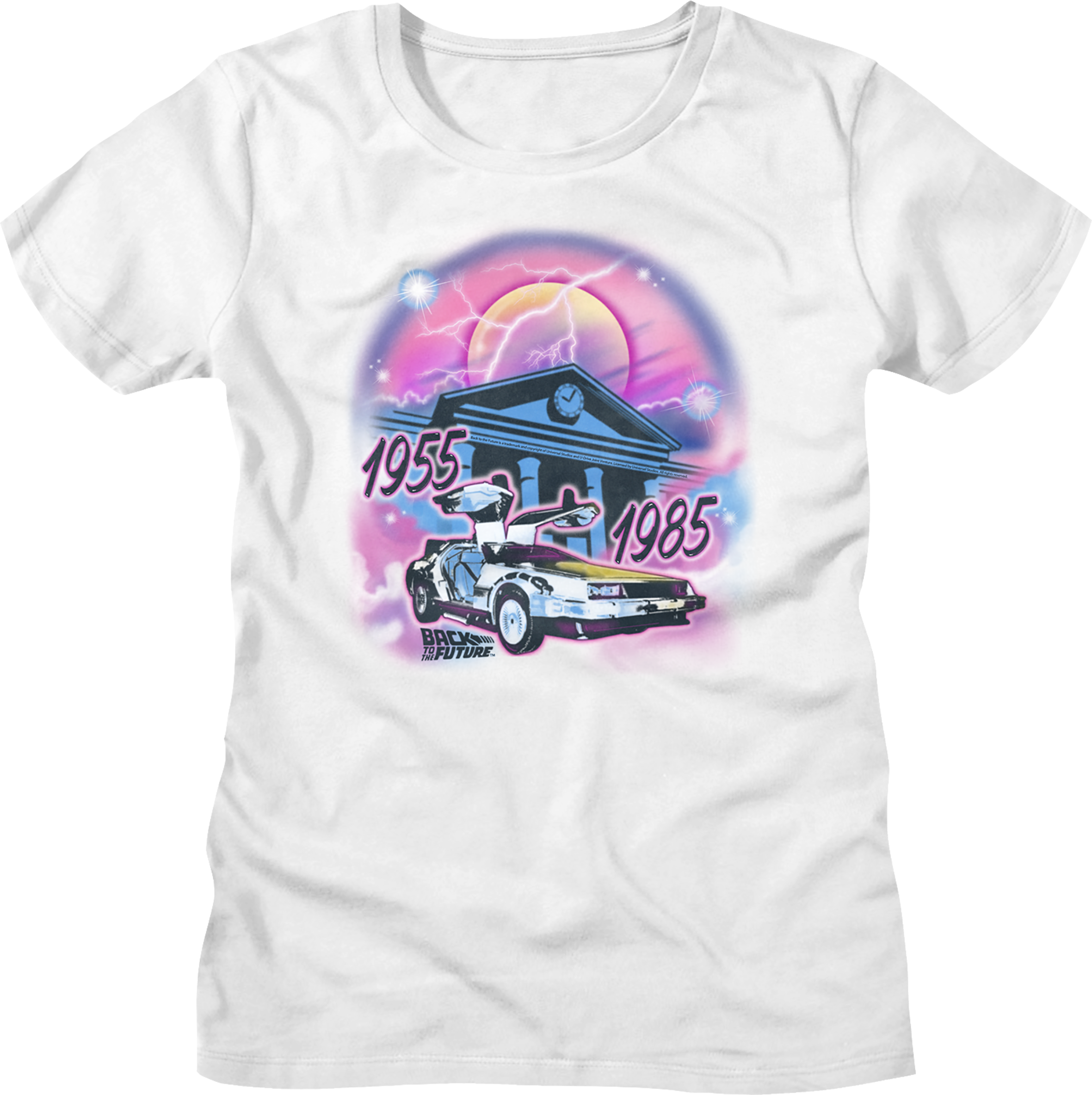 This womens Back To The Future shirt shows an airbrushed image of Doc Brown's DeLorean parked in front of the Hill Valley Courthouse and clock tower. The shirt shows the years 1955 and 1985.