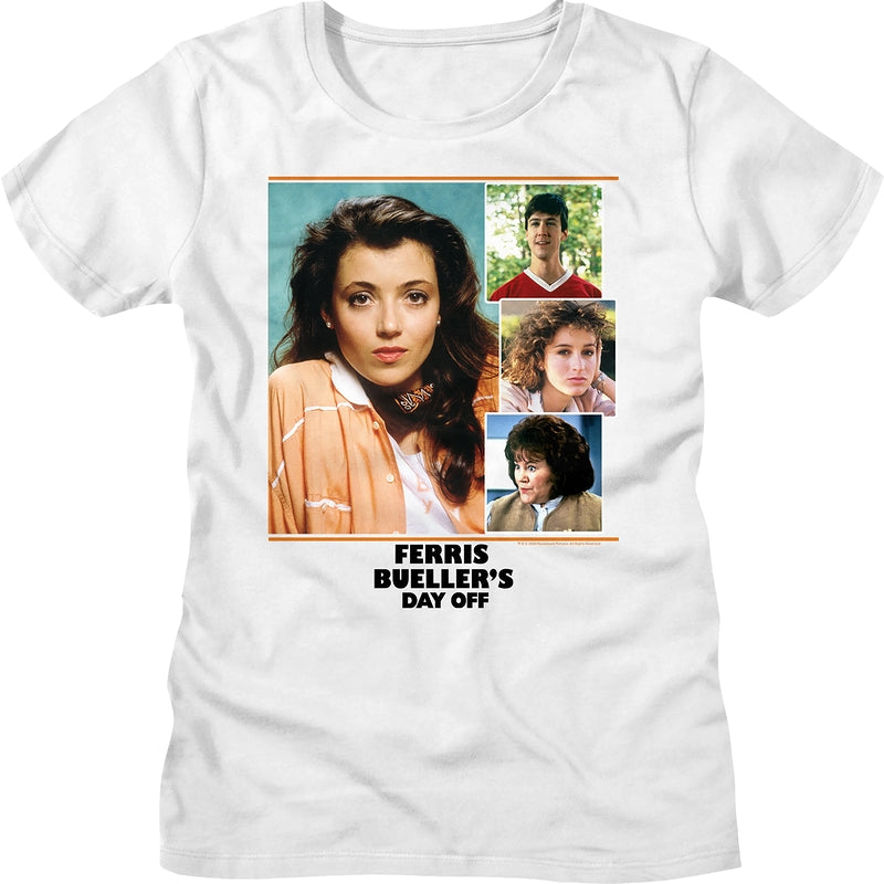 This womens Ferris Bueller's Day Off shirt features a collage of Ferris's girlfriend Sloane, his best friend Cameron, his sister Genie, and Grace, the secretary from Ferris's high school.