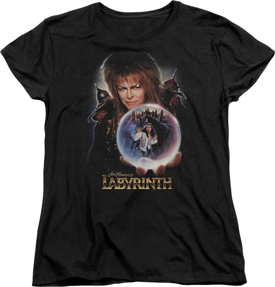 This womens Labyrinth shirt features the poster artwork for the 1986 fantasy film. The artwork shows Jareth the Goblin King holding one of his crystal balls. The shirt shows Sarah Williams trapped in the crystal ball.