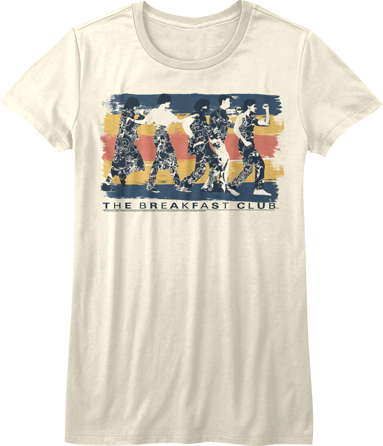This Womens Dancing Breakfast Club Shirt shows the characters dancing in a line with a background of colored stripes. Allison, Claire, John, Brian, and Andrew learned more than expected when they found themselves together in Saturday detention. They shared secrets, laughs, tears, and angst in the timeless coming of age story. Each of them showed off their '80s dance moves while they made the most of their time in the school library.
