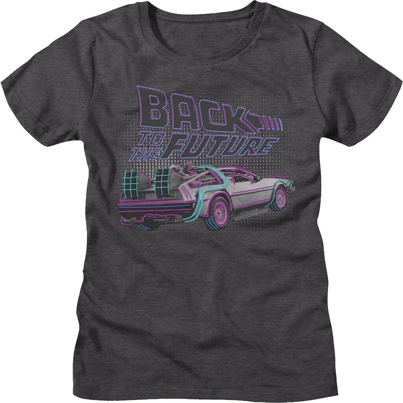 This womens Back To The Future shirt shows Doc Brown's time traveling DeLorean outlined in bright neon colors.