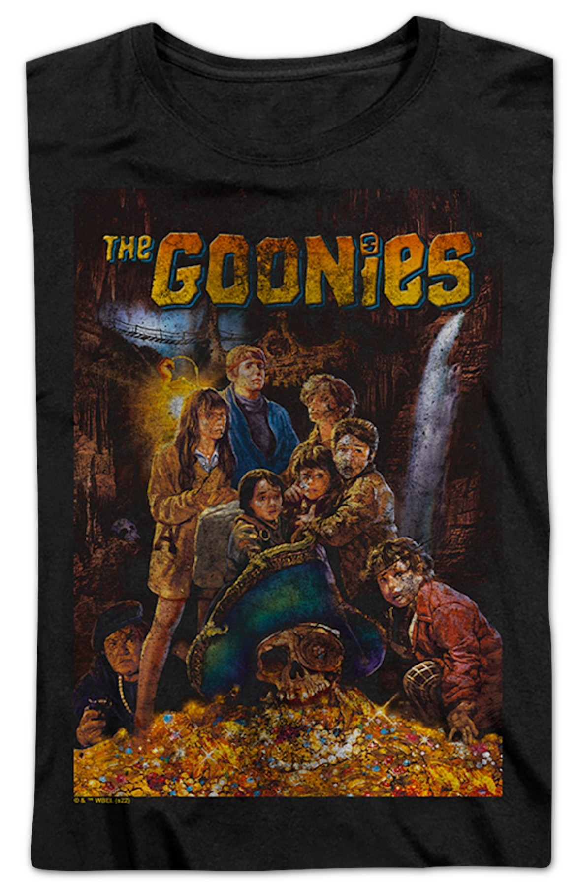 This womens Goonies shirt features the poster for the 1985 classic. The poster shows Mama Fratelli, Andy, Brand, Data, Mikey, Mouth, Stef, Chunk, and One-Eyed Willy's treasure.