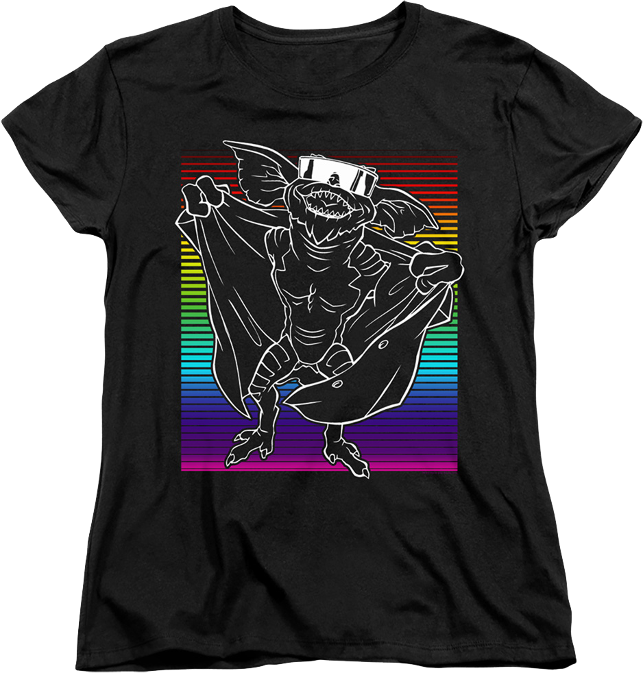 With an open trench coat and sunglasses, the Flasher Gremlin is one of the most instantly recognizable gremlins. For any fan of the Gremlins franchise, this Womens Neon Flasher Gremlins Shirt is a must have!