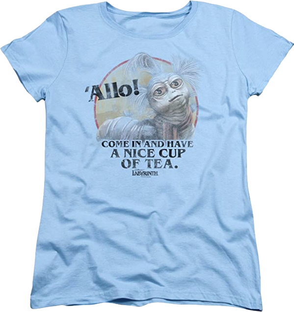 This womens shirt features an image of the worm from Labyrinth. The shirt shows the worm's quote 'Allo! It's not hello, but it's close enough. The shirt reads Come In And Have A Nice Cup Of Tea.