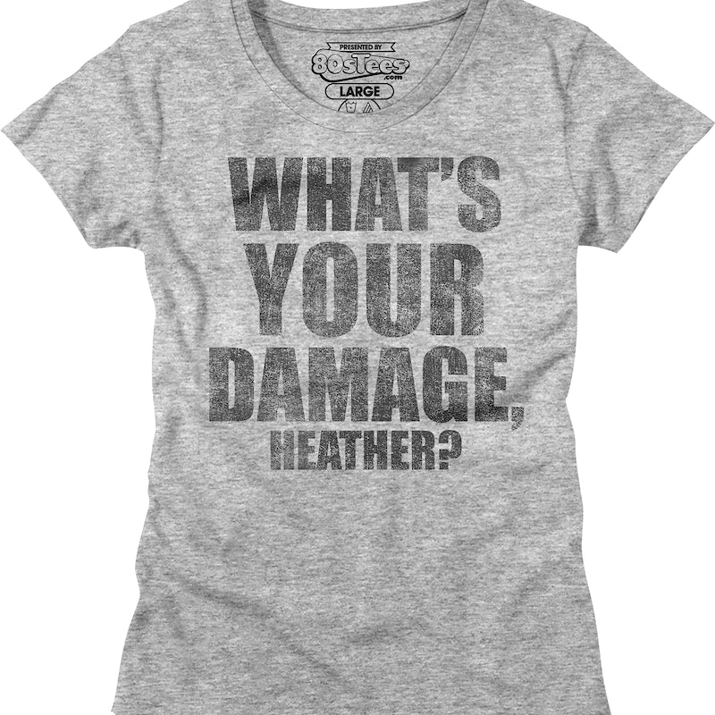 This 80sTees.com exclusive womens Heathers t-shirt features Veronica Sawyer's popular question, "What's Your Damage, Heather?"