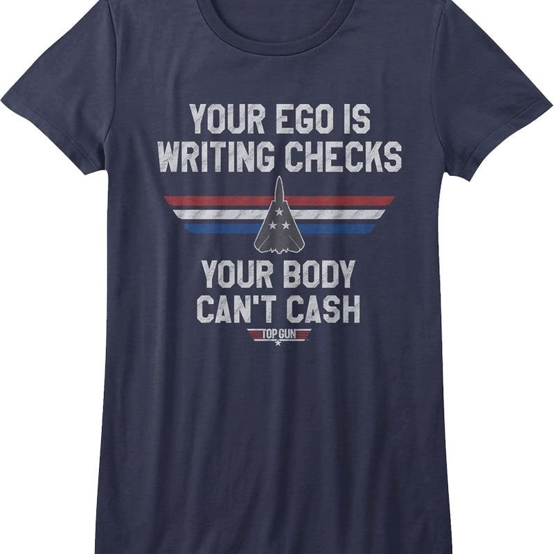 This womens Writing Checks Top Gun shirt shows the logo from the 1986 movie with an F-14 Tomcat fighter jet. The shirt reads "Your ego is writing checks your body can't cash". When Stinger reprimanded Maverick and Goose, he had a litany of grievances including "a history of high-speed passes over five air control towers and one admiral's daughter!"