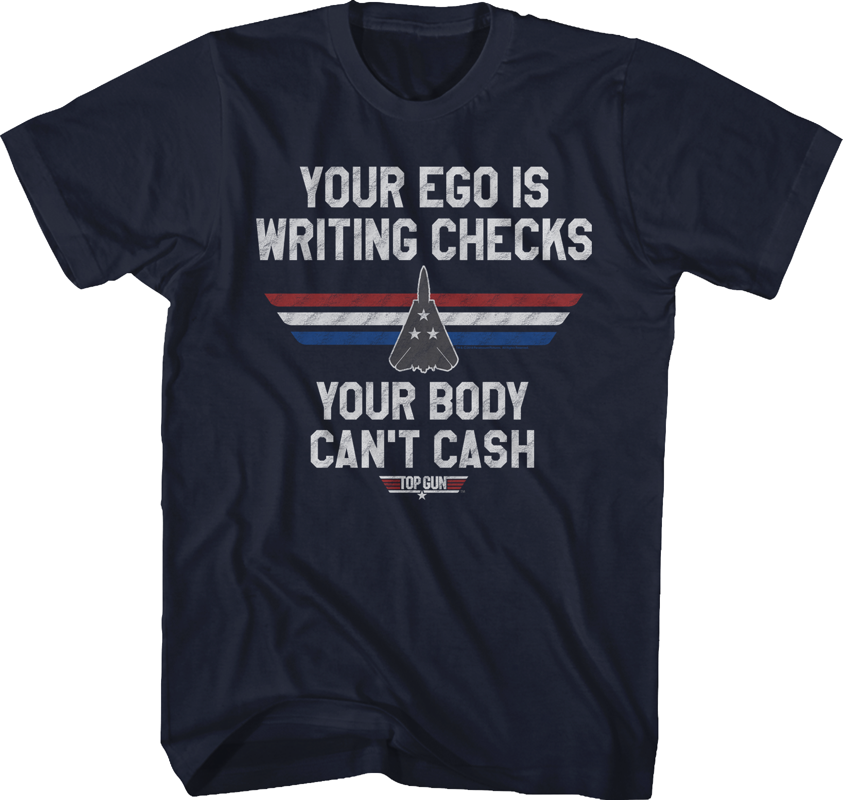 This Writing Checks Top Gun T-Shirt shows the logo from the 1986 movie with an F-14 Tomcat fighter jet. The shirt reads "Your ego is writing checks your body can't cash". When Stinger reprimanded Maverick and Goose, he had a litany of grievances including "a history of high-speed passes over five air control towers and one admiral's daughter!"