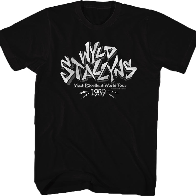 In the distant future, there will be no war or poverty due to the influence of the greatest rock band in history, the Wyld Stallyns. This Bill And Ted's Excellent Adventure shirt features the logo for the Wyld Stallyns, which is made up of Bill S. Preston, Esq., 'Ted' Theodore Logan, and the Princesses. Now, you can show everyone what a t-shirt from Bill and Ted's Most Excellent World Tour 1989 would look like. For any fan of Bill And Ted's Excellent Adventure, this Wyld Stallyns Excellent Tour shirt is a must have. This is the perfect shirt to wear to the next San Dimas Battle of the Bands.