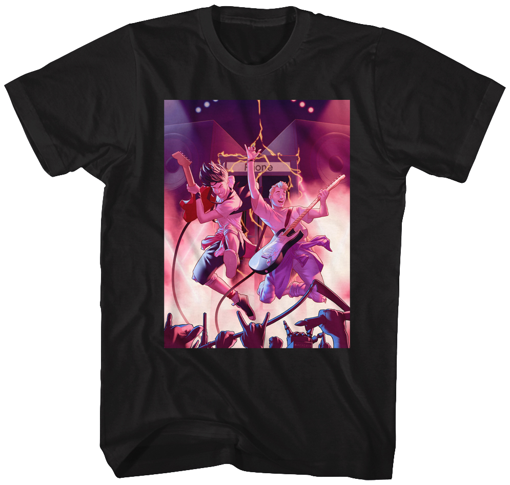 This Bill and Ted's Excellent Adventure t-shirt features an illustrated image of Bill and Ted leaving their time traveling phone booth to perform live as their most triumphant band, the Wyld Stallyns.