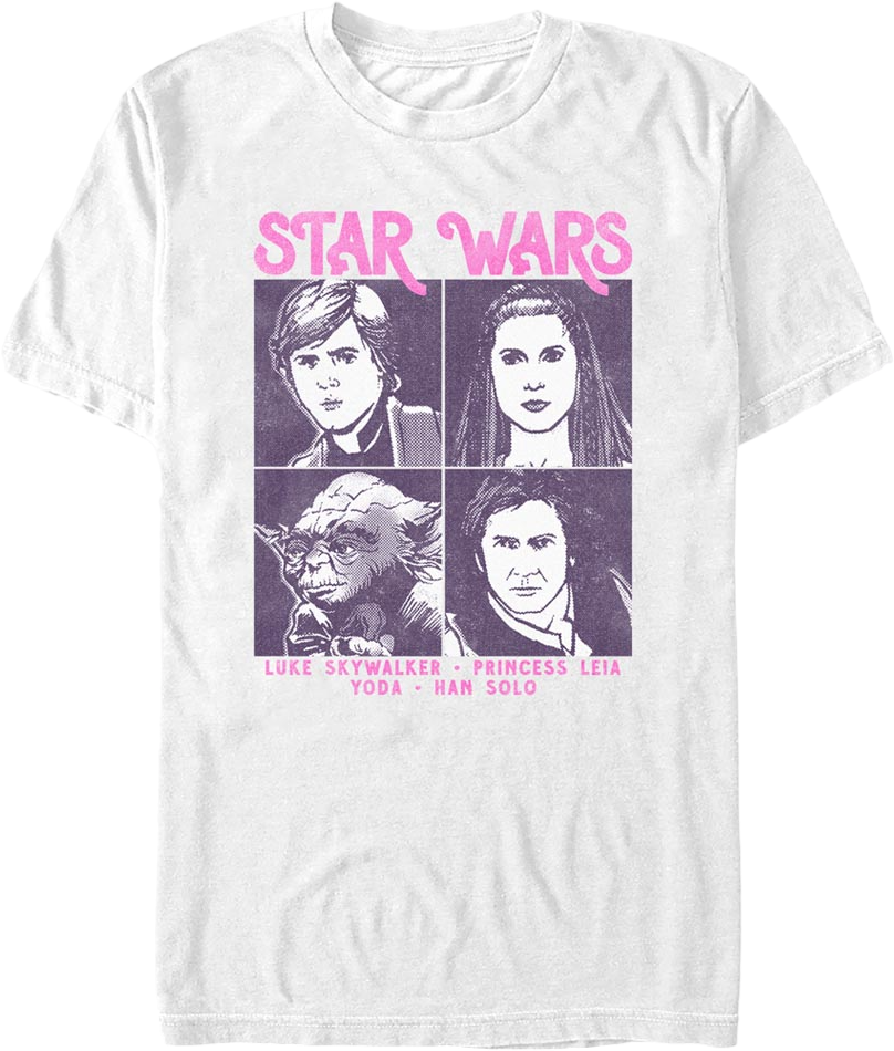 This Star Wars t-shirt features yearbook pictures of Luke Skywalker, Princess Leia, Yoda, and Han Solo.
