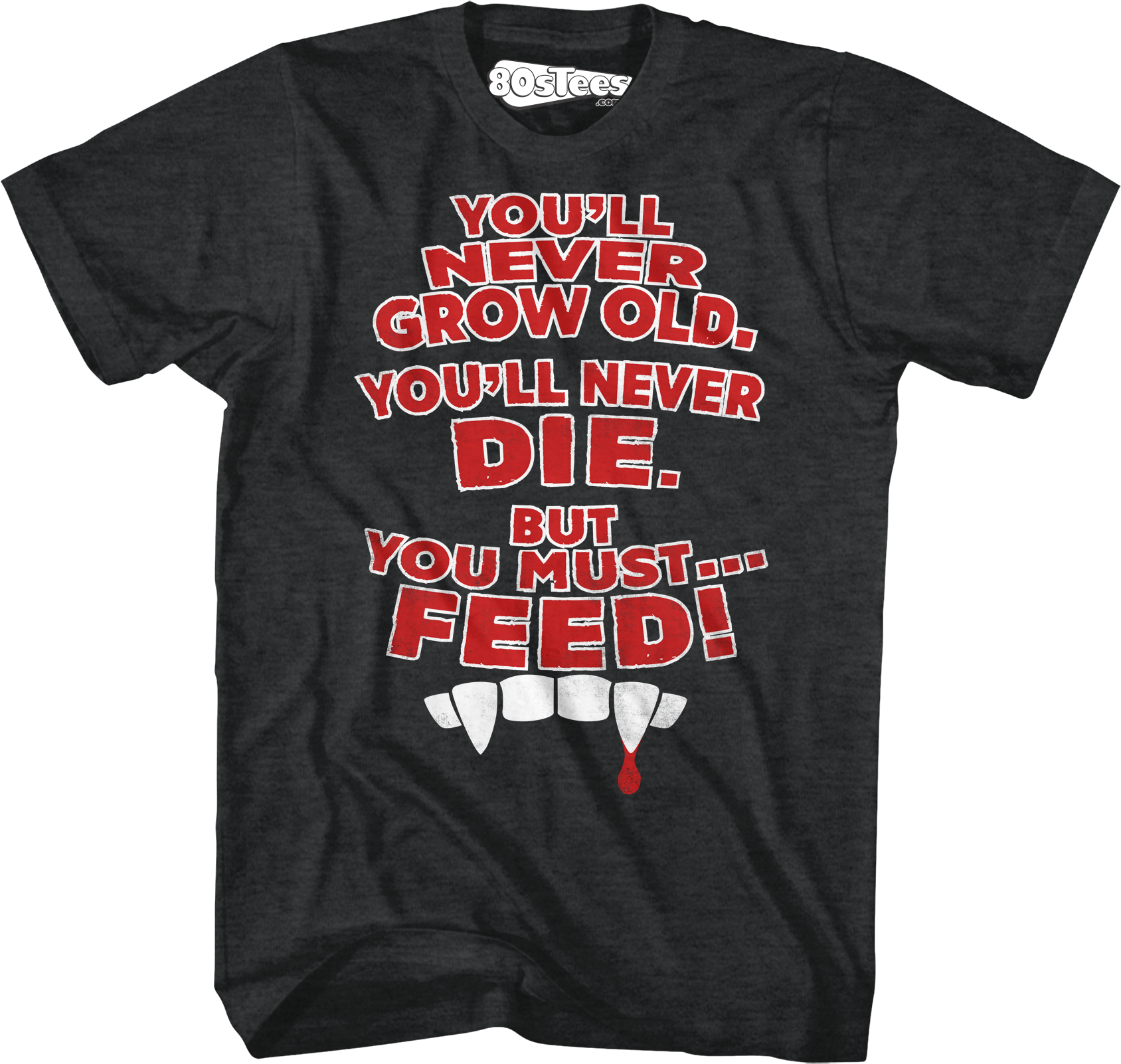 This 80sTees.com exclusive Lost Boys t-shirt shows a vampire's fangs and a single drop of blood. The shirt reads You'll Never Grow Old, You'll Never Die. But You Must...Feed!
