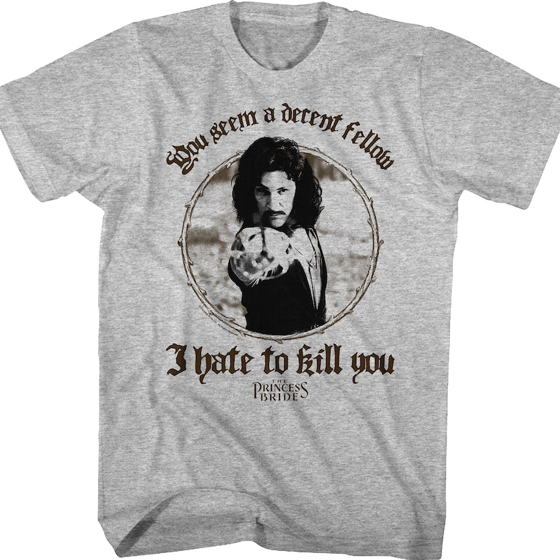 This Princess Bride t-shirt shows Inigo Montoya pointing his sword. The shirt reads You seem a decent fellow I hate to kill you.
