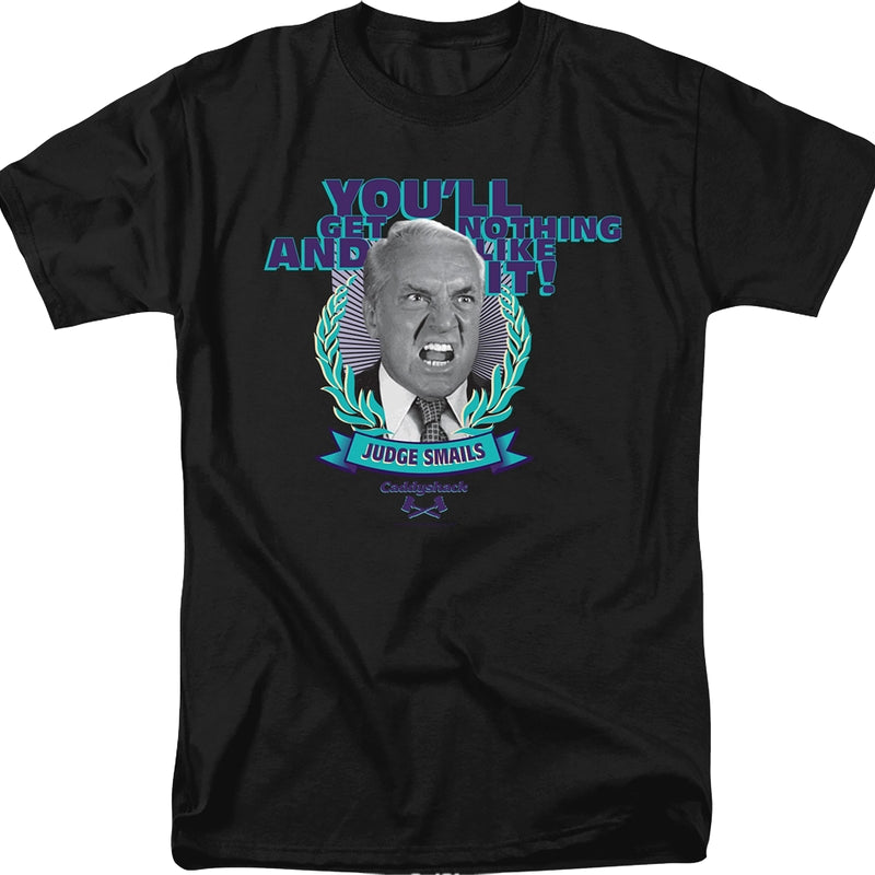 This Caddyshack t-shirt features an image of Judge Elihu Smails. The shirt includes his classic quote, "You'll get nothing and like it!"