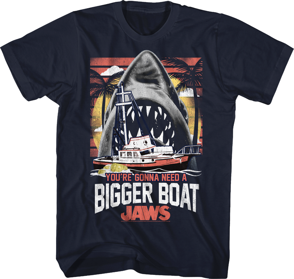This You're Gonna Need A Bigger Boat Jaws T-Shirt shows the great white shark that terrorized Amity Island. The shark's face is shown behind Quint's boat named Orca with a sunset background. The shirt includes Chief Brody's quote, "You're gonna need a bigger boat" along with the film's logo. Steven Spielberg's classic Jaws splashed into theaters in 1975 and became one of the most memorable movies in cinematic history. With thrills, scares and a twenty-five foot shark (three tons of him), Jaws has appeared on countless lists as one of the greatest movies of all time!