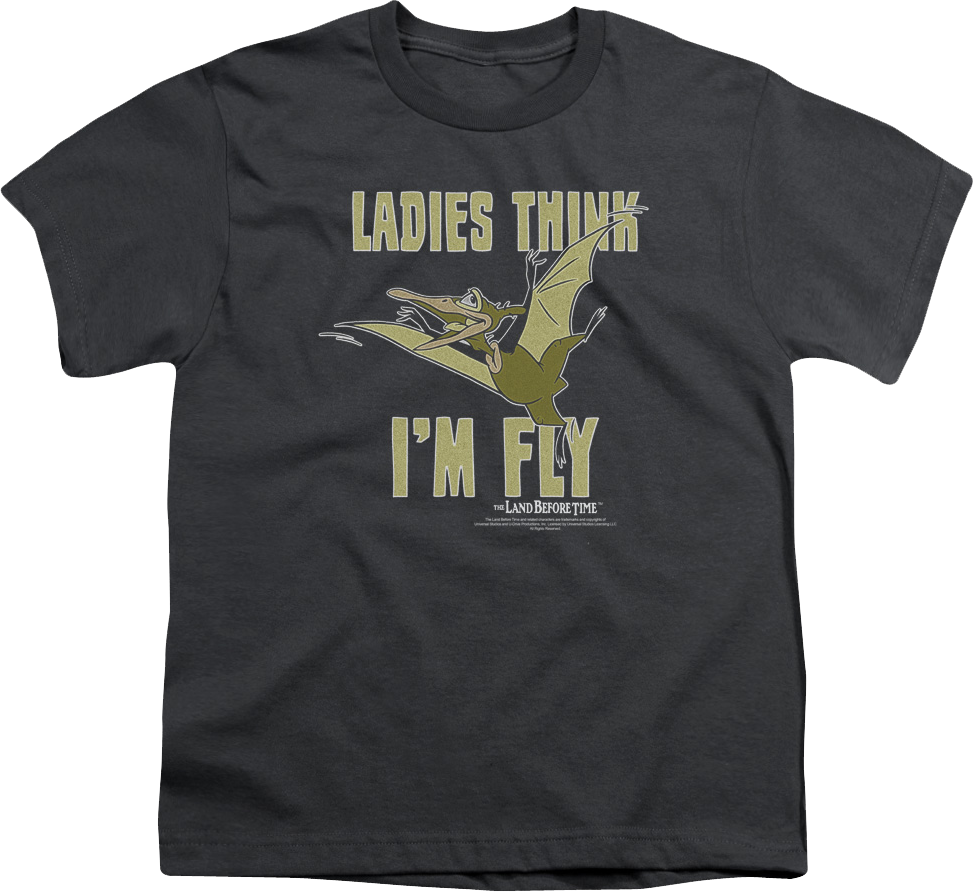This youth Land Before Time shirt features an image of Petrie. The shirt reads Ladies Think I'm Fly.