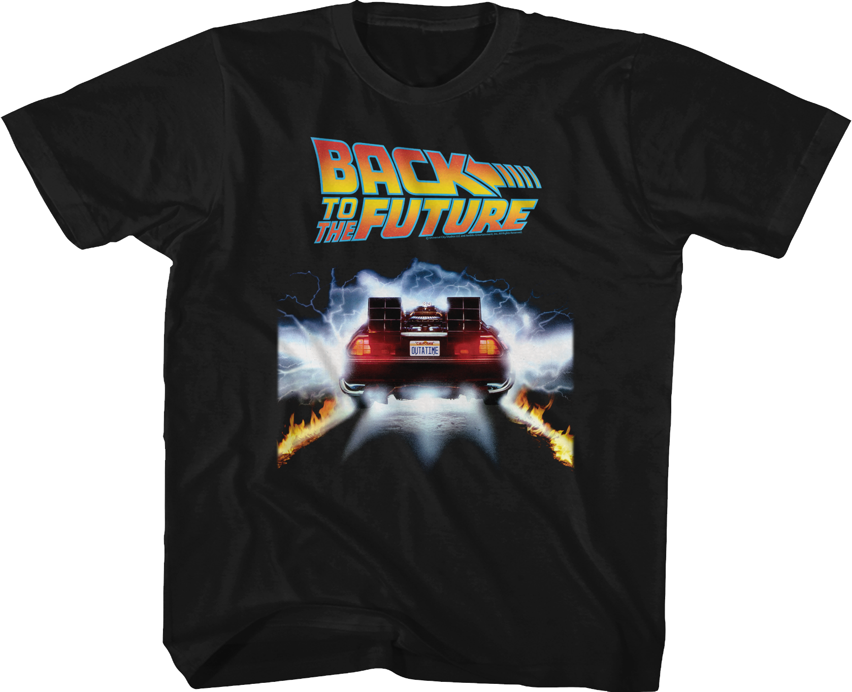 This youth Back To The Future shirt shows Doc Brown's DeLorean leaving fire tracks. The shirt includes the car's iconic license plate, which reads OUTATIME.