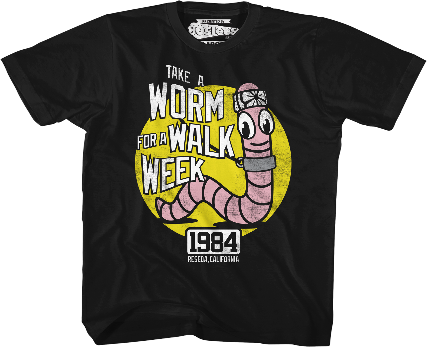This youth 80sTees.com exclusive shirt features an image of a worm on a leash in Reseda, California in 1984. The worm is wearing Mr. Miyagi's Tenugui headband. The shirt reads Take A Worm For A Walk Week.